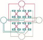16-узловая система хранения данных, представленная в виде grid-конфигурации. В grid-конфигурации сеть из 16 узлов можно разбить на четыре сегмента по четыре узла, и каждый из этих сегментов подключить к четырехпортовому коммутатору. В дополнение к этому еще четыре таких коммутатора можно подключить к одному из узлов в каждой из четырех групп. В итоге мы опять получим 32 проводных соединения (как и в предыдущем случае), но не два 16-портовых коммутатора, а восемь четырехпортовых (количество портов таким образом осталось неизменным). Каждый из узлов сети подключен опять-таки к двум коммутаторам. Однако в случае отказа одного из коммутаторов в grid-конфигурации остается множество возможных маршрутов для обмена данными между узлами. Иными словами: grid-конфигурация обладает значительно большей надежностью и устойчивостью. Еще одно достоинство: расширение сети предполагает лишь установку дополнительных коммутаторов с небольшим количеством портов, и при этом не требуется проектировать заново структуру сети.