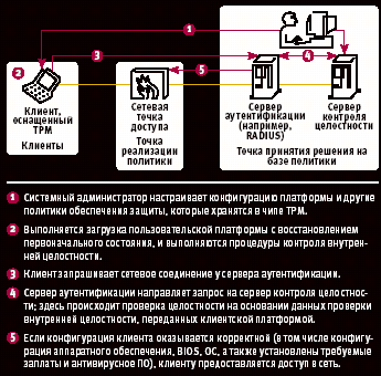 Для того чтобы реализовать правила защиты, ИТ-администратор может запрограммировать микросхему TPM на каждом клиенте. После того как пользовательская платформа загружена, микросхема выполняет оценку ее целостности и запрашивает разрешение на соединение, обращаясь к серверу аутентификации. Сервер аутентификации передает запрос серверу целостности, который проверяет систему-клиента. Если установлено, что клиент имеет корректную конфигурацию с соответствующими BIOS, операционной системой, заплатками, антивирусными программами и другими элементами, он получает доступ к сети.