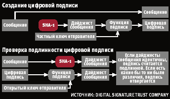 Сообщение отправителя помечается кодом аутентификации при помощи алгоритма SHA1, или алгоритма хеширования, создает так называемый дайджест сообщения, который, в свою очередь, присваивает сообщению свой уникальный символ. Расчет дайджеста позволяет убедиться в подлинности подписи