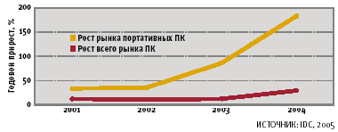 Российский рынок персональных компьютеров (в него включаются собственно ПК, ноутбуки и Intel-серверы) растет весьма неравномерно. С 2002 года продажи портативных компьютеров увеличиваются быстрее, и в ближайшие годы ожидается сохранение этого положения