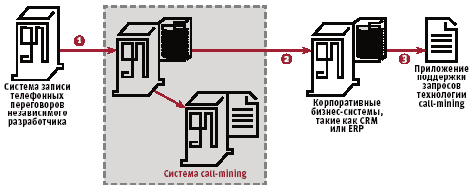 Типичная платформа call-mining, основанная на базе данных, преобразует аудиозаписи в текст, что позволяет предоставить пользователям возможность обращаться с запросами к базе данных телефонных переговоров