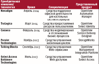 Начиная с середины 2003 года в развитии OpenView компания HP активно применяла принцип приобретения чужих наработок. Приведенная ниже таблица позволяет составить представление, какие из составных частей OpenView обязаны своим возникновением ранее независимым компаниям
