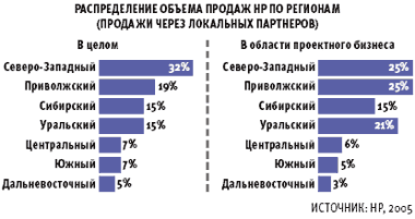 В настоящее время самым прибыльным для HP регионом в России является Северо-Западный федеральный округ — на него приходится почти треть всех продаж компании через локальных партнеров. На втором месте — Приволжский округ, на третьем — Уральский. Центральный же округ занимает одно из последних мест, что объясняется тем, что в расчетах его показателей в HP не учитывают Москву