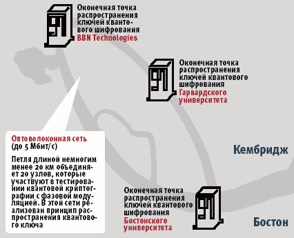 В BBN и Гарвардском и Бостонском университетах работает тестовая сеть, в которой реализованы принципы квантовой криптографии, предполагающего передачу единичных фотонов для распространения ключей шифрования сообщений