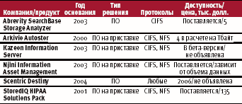 Более крупные и давно работающие на рынке компании, такие как EMC и Network Appliance, выпускают дисковые массивы и программное обеспечение, работающее с файл-ориентированными данными. Продукты EMC Centera и NetApp NearStore Appliance работают с данными, размещаемыми как в файловой системе Microsoft Common Internet File System (CIFS), так и в Network File System (NFS), используемой в средах на платформах Unix/Linux.
