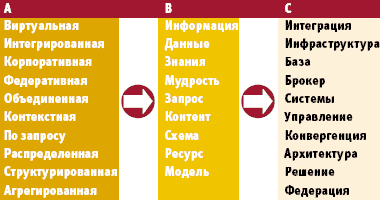 Влиянию моды подвержено практически все, в том числе и слова, и даже специальные термины. Сейчас мода на аббревиатуру EII, как недавно была на такие названия, как виртуальные базы данных, брокеры виртуальных данных, объединенные системы обработки запросов, управление объединенными данными и интеграция корпоративного контента. Впрочем, в мире слов в роли кутюрье может выступить едва ли не каждый. На месте EII могло бы оказаться любое словосочетание, собранное из слов в приведенных ниже столбцах. Поупражняться в этой нехитрой комбинаторике может любой