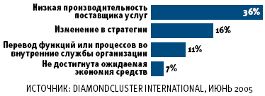 Принятие идеологии аутсорсинга наталкивалось на препятствия с самого начала. Недостаточно хорошо налаженное взаимодействие между сторонами, неспособность компаний управлять совместной работой и оценивать производительность, а также прибавившиесяся недавно новые обстоятельства — необходимость соблюдать законодательные требования и недостаток опытных менеджеров по аутсорсингу приводят к тому, что компании отказываются от услуг аутсорсинга. К основным причинам разрыва аутсорсинговых контрактов, по данным опроса 210 клиентов и 242 поставщиков услуг аутсорсинга, можно отнести следующие: