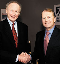 | Джеймс Макдональд и Джон Чамберс скрепляют рукопожатием соглашение о покупке |