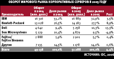 Корпорация IBM сохраняет свое лидерство на рынке серверов, контролируя 32,1% этого рынка. Значительный рост продаж серверов компаний Hewlett-Packard и Dell, ощутимо превышающий показатели других лидеров рынка, является отражением тенденции к использованию более дешевых, выпускаемых массовыми партиями машин