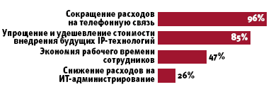 Опрос, проведенный Cisco Systems вместе с аналитической компанией Coleman Parkes Research, показал, что в России об IP-телефонии знают 95% представителей SMB. В целом почти половина — 45% опрошенных российских компаний малого и среднего бизнеса — видят прямую выгоду от использования IP-телефонии. При этом 38% компаний считают внедрение IP-телефонии обязательным условием успешного бизнеса, еще 43% полагают, что эта технология приобретет такую роль в течение трех лет, и лишь 6% российских респондентов высказали негативно-скептическое отношение к IP-телефонии с точки зрения ее ценности для бизнеса. В первую очередь SMB-компании видят пользу от IP-телефонии в сокращении расходов на связь (96%), почти половина опрошенных также считают, что она экономит время сотрудников