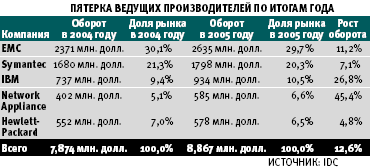 Оборот этого рынка за 2005 год достиг 8,9 млрд. долл. при годовом росте в 12,6%. Наибольший вклад в этот рост принадлежит сектору средств тиражирования, где рост составил 21,7%. Среди компаний на этом рынке лидирует с большим отрывом EMC, которой по итогам года принадлежит 29,7% этого рынка. Symantec контролирует 20,3%, IBM — 10,5%, правда, в четвертом квартале корпорация продемонстрировала исключительные темпы роста — 32,6%.