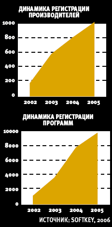 Рост оборотов Internet-регистраторов в 2005 году составил 60-70% на общем фоне роста ИТ-отрасли на 24%, что позволяет считать онлайновые продажи программного обеспечения весьма перспективным видом деятельности. При этом продажи в регионах кроме Москвы и Московской области составляют около трети всех продаж, что объясняется низким уровнем доли пользователей Internet в регионах России. О росте числа зарегистрированных производителей и программ можно судить по показателям компании Softkey, которые в процентном соотношении будут верны для всего рынка