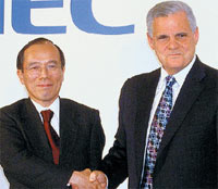 | Президент NEC Каору Яно и глава EMC Джо Туччи скрепляют союз компаний рукопожатием |