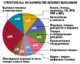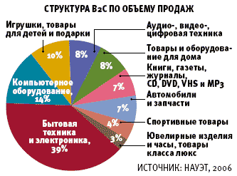 | По данным НАУЭТ, самое большое число российских Internet-магазинов сегодня специализируется на продаже бытовой техники и электроники (136), книгопечатной и аудио/видеопродукции (65), автозапчастей (65), и их количество растет невероятными темпами - на 260, 310 и 325% соответственно по отношению к 2004 году. |