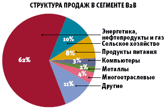 | Сегмент B2B в 2005 году, по оценке НАУЭТ, вырос втрое, составив 1,3 млрд. долл. При этом 62% оборота (806 млн. долл.) пришлось на компании топливно-энергетического комплекса, 125 млн. долл. - на сельскохозяйственные площадки и 110 млн. долл. - на торговлю продуктами питания. |