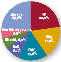 систем хранения, где рост составил 10,5%. В этом секторе лидирует компания EMC с оборотом в 911 млн. долл. и 21,8-процентной долей рынка. Темпы роста этой компании опережают рост рынка и составляют 12,6%. Однако на рынке систем хранения в целом она пока третья после Hewlett-Packard и IBM.