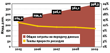 По оценкам аналитиков International Data Company, общие затраты на передачу данных в мировом масштабе в ближайшие годы будут расти, к 2009 го?ду достигнув почти 400 млрд. долл. Правда, темпы прироста расходов будут падать, хотя и незначительно, — с 11% в 2006 году до приблизительно 10% в 2009-м