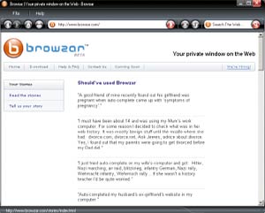 | Программное обеспечение Browzar автоматически удаляет временные файлы Internet, журналы, идентификационные файлы (cookies) и автоматически заполняемые формы. На сайте Browzar есть раздел, где пользователи рассказывают о случаях получения информации о различных весьма нелицеприятных фактах из жизни своих друзей и возлюбленных, о которых они предпочли бы не знать |