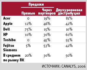 Примерно половина всех компьютеров в регионе EMEA приходят к потребителю через классическую двухуровневую дистрибьюторскую сеть. По данным исследовательской компании Canalys, менее 20% компьютерного оборудования производители сегодня продают напрямую, и увлечение прямыми продажами может пагубно отразиться на бизнесе в ближайшие несколько лет, как считают аналитики. Впрочем, из лидеров рынка ими «увлекается» только Dell. Компании Acer и Toshiba вообще не торгуют напрямую, а в Fujitsu Siemens прямые продажи составляют лишь 5% поставок.