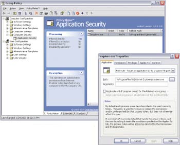 Главная особенность Policy Maker Application Security — возможность пользователей присваивать повышенные права доступа лишь определенным приложениям. Другие приложения не получают при этом временных прав администратора. В Windows Vista планируется использовать другое решение — User Account Control, которое позволяет администраторам сети выдавать отдельным пользователям временные пароли.