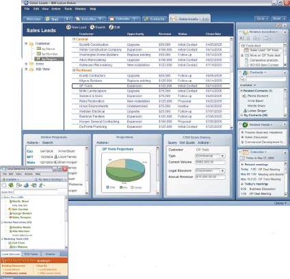 После того как в Notes была реализована технология J2EE, открылась возможность для создания компонентных приложений — таких, где подобно порталам, можно объединять в одну рабочую среду разные приложения. Например, можно совместить на рабочем месте автоматизацию продаж (Sales Force Automation, SFA) и управление отношениями с клиентами (Сustomer Relationship Management, CRM).