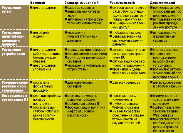 Используя данную матрицу, ИТ-менеджеры могут понять, на каком уровне находится ИТ-инфраструктура предприятия, и какими именно ее компонентами следует заняться в первую очередь
