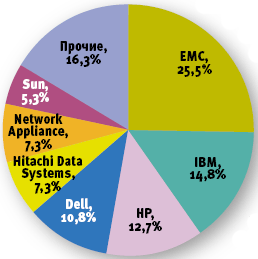 По данным Gartner, главные поставщики систем хранения объявили о двузначном росте продаж в III квартале — за исключением компании Hewlett-Packard. Продажи внешних дисковых массивов HP за три месяца, завершившиеся 30 сентября, упали на 11,9 % по сравнению с тем же периодом прошлого года, составив 475 млн. долл. Лидером рынка остается EMC, ее оборот вырос на 17,4%, достигнув 954 млн. долл. На втором месте IBM, оборот которой увечилился на 17,9%, до 553,1 млн. долл. Самый большой рост продемонстрировала Network Appliance — ее продажи увеличились на 20,4%, до 272 млн. долл. В целом мировой рынок дисковых систем хранения вырос по сравнению с тем же кварталом прошлого года на 7,4% и достиг 3,74 млрд. долл.