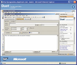 Duet, технология, которую SAP разработала совместно с Microsoft и выпустила в июне 2006 года, вызывает значительный интерес. С помощью интеграционного инструментария Duet пользователи могут обращаться к данным и процессам из приложений SAP через одно из офисных приложений популярного пакета Microsoft Office. Это программное обеспечение включает в себя возможности интеграции, ориентированные на различные сценарии ведения бизнеса с учетом таких факторов, как временные ограничения и специфика методов управления организацией.
