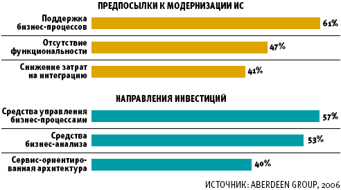 Компании готовы тратить значительные средства на обновление своих корпоративных систем, особенно на приведение в соответствие своих бизнес-процессов и ERP-приложений. Одной из наиболее актуальных технологий, согласно исследованию Aberdeen Group, является инструментарий для управления бизнес-процессами (Business Process Management, BPM).
