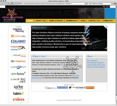Ряд компаний, предлагающих программное обеспечение категории Open Source, создали альянс Open Solutions Alliance (OSA) с целью разработки и внедрения свободно распространяемых бизнес-решений. Об этом было объявлено на прошедшей во второй половине февраля в Нью-Йорке встрече LinuxWorld OpenSolutions Summit. Участники альянса намерены работать с другими производителями и сообществом Open Source для того, чтобы улучшить интероперабельность между программными продуктами и активизировать внедрение свободно распространяемых инструментальных средств, предназначенных для бизнес-пользователей.