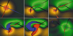 Ученые из НИИ твердотельных веществ (г. Юлих, Германия) заявили о теоретической возможности создания магнитного накопителя, значения бит в котором можно переключать с гигантской скоростью — за 5 пикосекунд, что почти в 100 раз меньше, чем занимает такт самых быстрых из существующих процессоров. Принцип действия накопителя основан на магнитных «вихрях», — явлении, наблюдаемом в круглых микромагнитах диаметром по 1 мкм. Каждый такой вихрь имеет «ядро» — стабильную область диаметром около 10 нм, характеризующуюся определенным направлением намагниченности. Компьютерное моделирование показало, что это направление можно изменять, включая на упомянутое время относительно слабое магнитное поле. При этом в дополнение к уже существующему вихрю сначала образуется еще пара разной ориентации, а затем снова остается только один вихрь с направлением намагниченности, противоположном первоначальному. На иллюстрации пересечения красной и синей полос указывают центры вихрей; оранжевый цвет обозначает направление намагниченности «вверх», зеленый — «вниз».