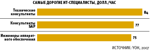 Самыми высокооплачиваемыми сотрудниками с повременной оплатой труда стали технические консультанты, специалисты по продуктам SAP и инженеры по обслуживанию аппаратного обеспечения. По данным аналитической компании Yoh, в среднем технические консультанты зарабатывают 84 долл. в час, консультанты SAP — 77 долл., а инженеры по аппаратному обеспечению — около 75 долл. Далее следуют разработчики средств ETL (Extract, Transform and Load), проектные менеджеры и администраторы баз данных. В нижней части списка высокооплачиваемых специалистов оказались разработчики на платформах .Net и Java, зарабатывающие в час чуть более 50 долл. Средняя же зарплата ИТ-сотрудников составляет около 30 долл. в час. По сравнению с прошлым годом этот показатель вырос на 5,5%
