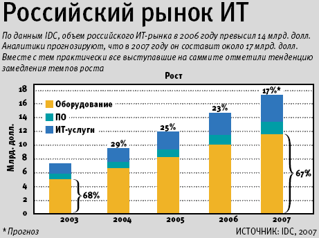 По данным IDC, объем российского ИТ-рынка в 2006 году превысил 14 млрд. долл. Аналитики прогнозируют, что в 2007 году он составит около 17 млрд. долл. Практически все выступавшие на саммите отметили тенденцию замедления темпов роста рынка, выразив, однако, неоднозначное отношение к ней. Естественность и неизбежность начавшегося «торможения» всем понятны, но от этого не становится менее тревожно.