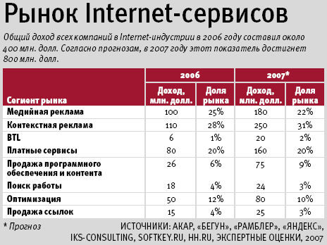 Следует сказать, что замедление развития Internet-аудитории заметили не только социологи фонда «Общественное мнение», но и ведущие игроки сетевого рынка. Первые же слайды их совместного доклада, который открывал конференцию, показали, что эпоха экстенсивного расширения рынка окончилась. Теперь для успешного развития нужно учитывать уже сложившиеся тенденции и удовлетворять новые потребности старой аудитории. Впрочем, на текущий момент аудитория наиболее известных порталов сравнялась с количеством слушателей радиостанций, что говорит о достаточно высокой доле проникновения Internet — она оценивается сегодня в 28% численности населения. При этом общий доход всех компаний в Internet-индустрии в 2006 году составил около 400 млн. долл. В 2007 году, как ожидается, этот показатель будет удвоен.