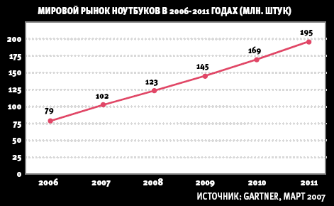Еще в январе нынешнего года аналитики Gartner прогнозировали, что объем мирового рынка ноутбуков составит в этом году 99 млн. штук, а рубеж в 100 млн. будет преодолен лишь в 2008 году. Но уже в марте прогноз был скорректирован в сторону его улучшения — таким образом в Gartner все же согласились с оценками тайваньских производителей ноутбуков, которые высказывались еще в феврале прошлого года. По прогнозам Gartner, среднегодовой рост мирового рынка ноутбуков в 2007-2011 годах должен составить 18%. В России, как утверждают в Intel, ссылаясь на независимые маркетинговые исследования, нынешние темпы роста рынка ноутбуков гораздо выше — более 50% в первом квартале текущего года по сравнению с аналогичным периодом 2006 года