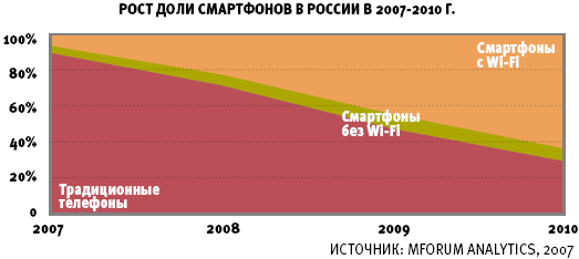 По данным компании MForum Analytics, в России по итогам 2006 года доля смартфонов в объемах продаж сотовых телефонов достигла 4% (в штучном выражении). При этом доля моделей с поддержкой Wi-Fi составила более 40% от общего объема продаж смартфонов. В этом году прогнозируется более чем трехкратный рост продаж смартфонов с Wi-Fi в штучном выражении. По мнению аналитиков, такой рост будет являться следствием снижения средней стоимости смартфонов с Wi-Fi более чем на 20% и значительным расширением модельного ряда этих устройств. Рост продаж смартфонов без поддержки Wi-Fi в 2007 году буде значительно ниже — всего 60%. К 2010 году MForum Analytics прогнозирует рост годовых продаж смартфонов на российском рынке до уровня свыше 20 млн. штук. А наличие Wi-Fi к 2010 году станет стандартной опцией даже для моделей средней ценовой категории. При этом средняя цена смартфона в России к 2010 году снизится до уровня менее 290 долл.