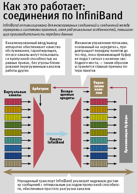 В InfiniBand применяется основанный на «кредитах» механизм управления потоками данных, который гарантирует целостность соединения, поэтому пакеты редко теряются. При использовании InfiniBand пакеты не начнут передаваться до тех пор, пока не будет получено подтверждение о наличии пространства в буфере получателя. Получатель выдает «кредит», чтобы уведомить о наличии буферного пространства, после чего начинается передача пакетов. Благодаря этому пакеты не будут теряться в случае перегрузки сети, значительно увеличивается эффективность и растет общая производительность ввода/вывода.