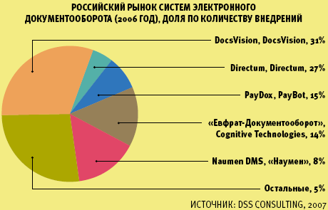 На втором партнерском форуме, прошедшем в середине июня под Санкт-Петербургом, местная компания DocsVision, разработчик одноименной системы электронного документооборота, объявила о планах увеличения к 2010 году оборота примерно в шесть раз. В 2006 году он вырос на 98%, а компания, по данным DSS Consulting, переместилась с третьего места на российском рынке систем электронного документооборота на первое — по количеству внедрений. В абсолютных же цифрах оборот компании немного превышает 1 млн. долл., а совокупная стоимость всех проектов DocsVision (с доходами партнеров) оценена примерно в 5 млн. долл.