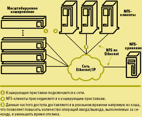Поддержка высокоскоростной кэш-памяти большой емкости как разделяемого сетевого ресурса для выполнения запросов с интенсивным вводом/выводом позволяет снизить потребность в избыточных системах хранения в центрах обработки данных, а также обеспечить гарантированное качество обслуживания для всех серверов приложений и систем хранения на базе сетевой файловой системы NFS.