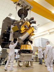 Космический аппарат Deep Impact, который 4 июля 2005 года бомбардировал 370-килограммовой болванкой комету Темпеля-1, будет подготовлен к выполнению новых миссий NASA. На этот раз 5 декабря 2008 года ему предстоит отправиться к комете Бетина. Аппарат проведет анализ состава поверхности кометы с помощью инфракрасного спектрометра, а по пути к ней посредством бортового телескопа исследует обнаруженные недавно планеты с массой Юпитера, вращающиеся вокруг ближайших к нам звезд, и попытается отыскать планеты, подобные нашей Земле. После сближения с кометой Темпеля-1 Deep Impact был выведен из ее шлейфа, и с тех пор движется по орбите вокруг Солнца, ожидая дальнейших инструкций. В этом году операторам зонда предстоит провести полную проверку состояния его систем и отправить аппарат на облет Земли, который даст ему гравитационный толчок, необходимый для достижения кометы Бетина. (На фото: сборка Deep Impact инженерами компании Ball Aerospace.)