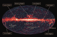 Спутник AKARI Японского управления аэрокосмических исследований на 90% завершил миссию построения подробной инфракрасной карты звездного неба, обладающей разрешением, в несколько раз большим, чем предыдущий атлас, который был составлен по показаниям спутника IRAS более двух десятилетий назад. Чтобы увеличить разрешение, кроме сканирования общей картины, AKARI провел направленные исследования 3,5 тыс. выбранных астрономами точек Вселенной. Яркое пятно на изображении — это Млечный путь. Светлые регионы, соответствующие сильному инфракрасному излучению, отвечают скоплениям вновь сформировавшихся звезд. Яркая область в правой нижней части изображения — Большое Магелланово облако, галактика по соседству с нашей, тоже находящаяся в периоде активного образования звезд