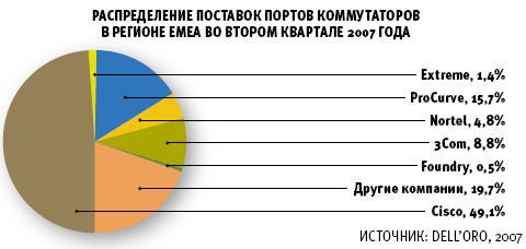Представленный ProCurve Networking by HP высокопроизводительный коммутатор ядра сети Switch 8212zl — свидетельство того, что компания не собирается снижать набранные в последнее время темпы. По данным Dell’Oro Group, во втором квартале поставки компании (в суммарном числе портов) увеличились на 46% по сравнению с тем же периодом прошлого года, в то время как соответствующий показатель мирового рынка составил 21%. Как результат продажи коммутаторов ProCurve составили, согласно Dell’Oro, во втором квартале 240 млн. долл., продажи находящейся на третьем месте компании Nortel Networks — 140 млн. долл. Со значительным отрывом на рынке коммутаторов с квартальными продажами, превысившими 3 млрд. долл., лидирует Cisco Systems. В регионе EMEA третью строчку рейтинга занимает 3Com, но два лидера — те же.