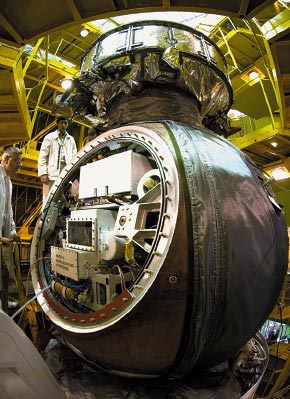 В середине сентября началась, а в конце месяца окончилась миссия российского космического аппарата Фотон-М3, на борту которого в ходе его пребывания на орбите было проведено около 40 экспериментов Европейского космического агентства в таких областях, как физика жидкостей, биология, радиология и др. Аппарат был запущен на борту ракеты-носителя Союз-У с космодрома Байконур. Одним из необычных экспериментов на борту Фотон-М3 стал Aquahab, аквариум для наблюдения влияния невесомости на одноклеточные организмы и рыбку-цихлиду. Еще один эксперимент под названием Biopan предусматривал прикрепление к теплозащитному экрану космического аппарата камней, содержащих живые микроорганизмы, которые должны были подвергнуться экстремальным температурам и давлениям при входе спускаемого модуля в атмосферу Земли. (На фото: подготовка Фотон-М3 к запуску.)