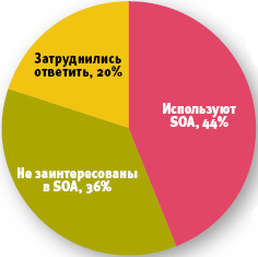 Как выяснилось в результате исследования, проведенного Hydrasight, компании довольно четко подразделяются на те, которые активно ведут внедрение сервисно-ориентированной архитектуры, и те, которые даже не планируют этого делать. Проведенный опрос ИТ-менеджеров показал, что 44% компаний уже используют SOA, а 35% не имеют к ней никакого интереса. Еще 20%, как ни странно, затруднились дать ответ. Помимо этого, компании выразили неуверенность в зрелости и надежности решений; 41% утверждают, что применяемые технологии являются незрелыми. Впрочем, почти все уверены, что к 2009 году ситуация изменится в лучшую сторону. Очевидно, на сегодняшний день существует ряд первопроходцев SOA, в целом довольных своим опытом.