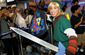 В США презентацию новой игры из серии The Legend of Zelda — Phantom Hourglass ее автор компания Nintendo провела в своем магазине Nintendo World в Нью-Йорке. Посетители имели шанс получить бесплатную копию игры, победив в викторине или в конкурсе костюмов (на фото — автор костюма, признанного лучшим). В ходе события также была организована экспозиция выпускавшихся в разное время сувениров на тему игры, от кукол героев до полноразмерных щита и меча, некогда принадлежавших создателю сериала Шигеру Миямото.