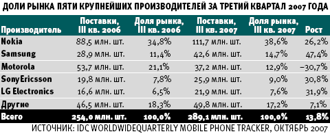 По данным IDC, в третьем квартале 2007 года продано в общей сложности 289,1 млн. мобильных телефонов. Рост продаж составил 9% по сравнению с предыдущим кварталом и 13,8% по сравнению с третьим кварталом прошлого года. Двумя основными тенденциями развития рынка стала продажа крупных партий дешевых аппаратов на развивающихся рынках и предложение новых моделей старшего класса на традиционных рынках. На первом место остается Nokia, которая второй квартал подряд добивается продаж свыше 100 млн. устройств. Samsung вышла на второе место, опередив Motorola.