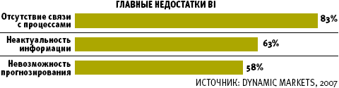 Исследование, проведенное Dynamic Markets, выявило несколько типичных проблем, связанных с использованием бизнес-аналитики (Business Intelligence, BI). Главной из них является то, что предоставляемая средствами BI информация является неактуальной. Большинство респондентов ответили, что им необходимо принимать решения еще до того, как нужная информация становится доступной. Таким образом, важнейшая часть возможностей бизнес-аналитики теряется, а сами системы используются лишь для создания официальных отчетов. Другой болезнью является то, что BI не способны идентифицировать проблемы процессов. Между тем 83% опрошенных менеджеров говорят, что именно процессы доставляют им головную боль. Наконец, большинство средств BI не могут эффективно использоваться с целью прогнозирования.