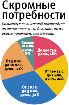 Во всяком случае представленные на форуме проекты не предполагают каких-либо прорывов на мировом рынке. В основном ИТ-компании нуждаются в относительно небольших инвестициях, измеряемых в миллионах или даже в сотнях тысяч долларов. Требуются привлеченные средства, как правило, для развития на российском рынке. Некоторым экспонентам нужны не столько сами деньги, сколько выстраивание своего бизнеса согласно требованиям венчурных фондов. Большинство проектов были представлены компаниями, которые уже добились определенных успехов.