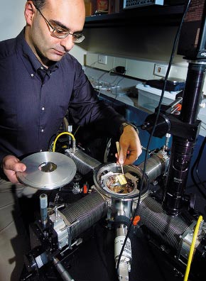В Университете им. Дж. Пэрдью по контракту с ВВС США разработаны микроскопические беспроводные датчики состояния подшипников для реактивных двигателей. Устройства, представляющие собой микроэлектромеханические системы, способны функционировать в экстремальных условиях, находясь внутри самих подшипников. Принцип действия датчиков состоит в контроле их температуры. Регистрируемая устройствами информация помогает не только спрогнозировать разрушение подшипника, но и примерно определить время, которое пройдет до отказа. Беспроводные MEMS-датчики выдерживают высокие температуры (300 °C) и не требуют собственной батареи — электроэнергия передается им методом индукции. (На фото: лабораторная установка для тестирования датчиков, воссоздающая для них условия пребывания внутри реактивных двигателей.)