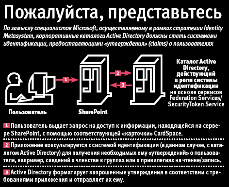 Сегодня SharePoint Server 2007 использует механизм аутентификации на основе сервиса каталогов Active Directory, с помощью которого осуществляется обмен информацией между машинами и системами. Существующая система идентификации SharePoint не позволяет приложениям добавлять дополнительные заявки к профилю пользователя.